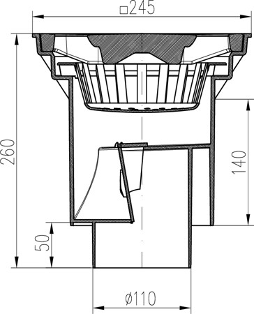 Desagüe de alcantarillado inferior D160/D110-250 válvula seca, rejilla de hierro fundido SPACE