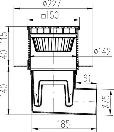 Desagüe lateral D75, nivel de agua, collar, rejilla de acero inoxidable