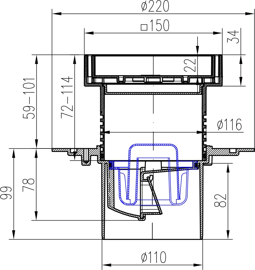 Drenaje de suelo, inferior D110, ala de acero inoxidable, la estructura, rejilla STEEL 150