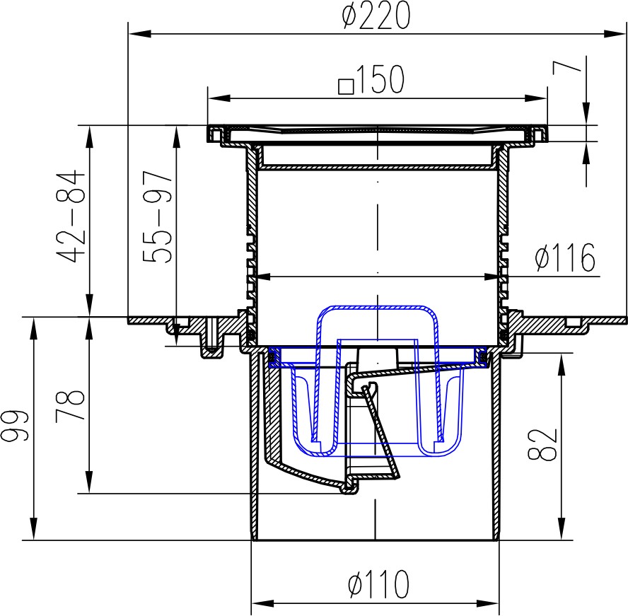 Drenaje de suelo, inferior D110, ala de acero inoxidable, la estructura, rejilla SUN