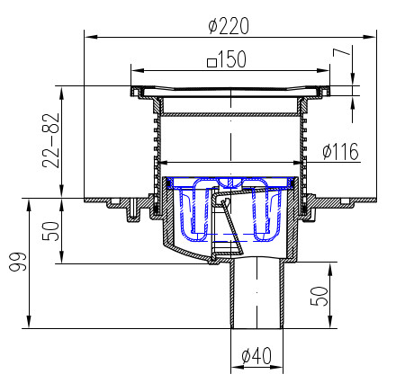 Drenaje de suelo, inferior D40, estructura de acero inoxidable, rejilla SUN 150