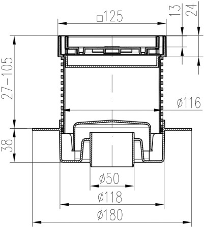 Drenaje de suelo, inferior D50, collar, estructura de acero inoxidable, rejilla STEEL 125