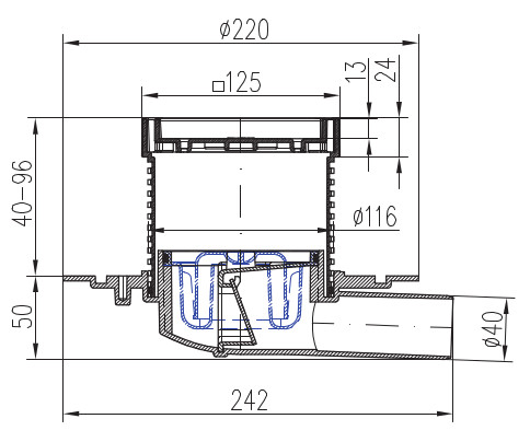 Drenaje de suelo, lateral D40, estructura de acero inoxidable, rejilla CERAMICS 125