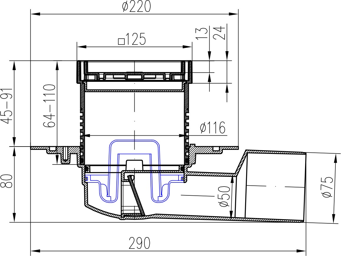 Drenaje de suelo, lateral D50/75, ala de acero inoxidable la estructura, rejilla STEEL 125