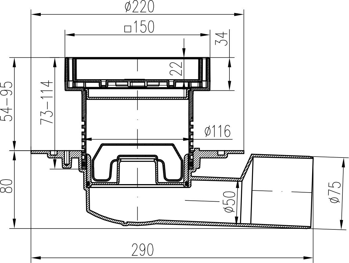 Drenaje de suelo, lateral D50/75 NEPTUN, ala de acero inoxidable la estructura, rejilla CERAMICS 150