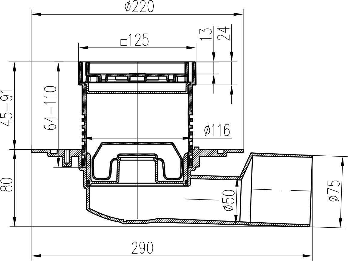 Drenaje de suelo, lateral D50/75 NEPTUN, ala de acero inoxidable la estructura, rejilla STEEL 125