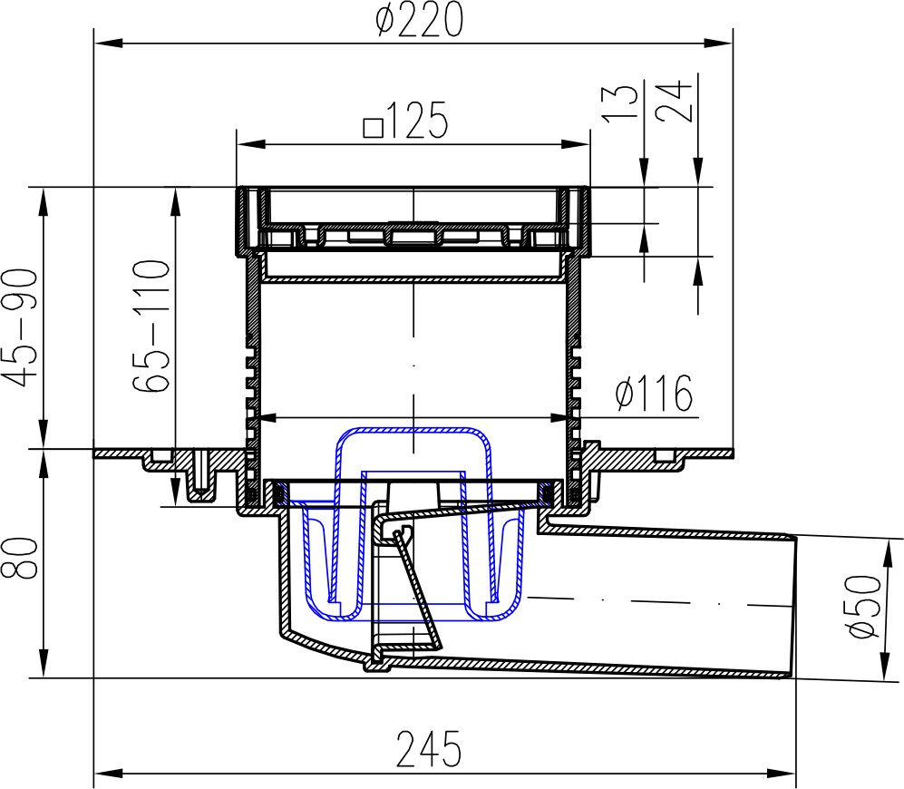 Drenaje de suelo, lateral D50, ala de acero inoxidable la estructura, rejilla CERAMICS 125