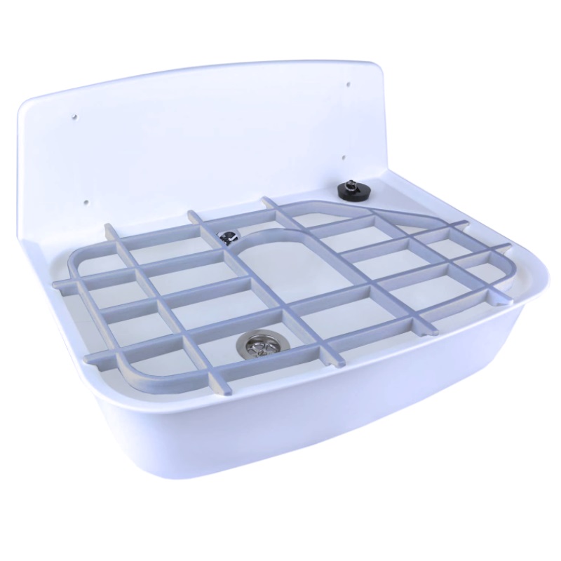 Fregadero de plástico blanco con rejilla y sifón