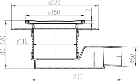 Sifón bajo, lateral D50, collar, marco completamente de acero inoxidable, rejilla SUN