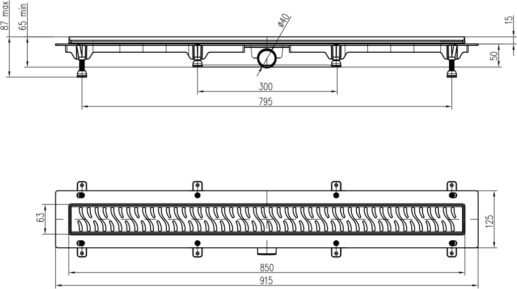 Sumidero lineal con marco de acero inoxidable y desagüe lateral, D40, 850 mm, rejilla Klasik mate