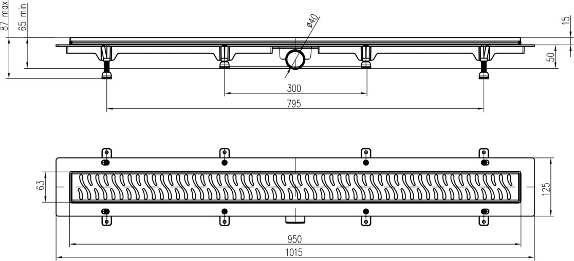Sumidero lineal con marco de acero inoxidable y desagüe lateral, D40, 950 mm, rejilla Klasik brilla