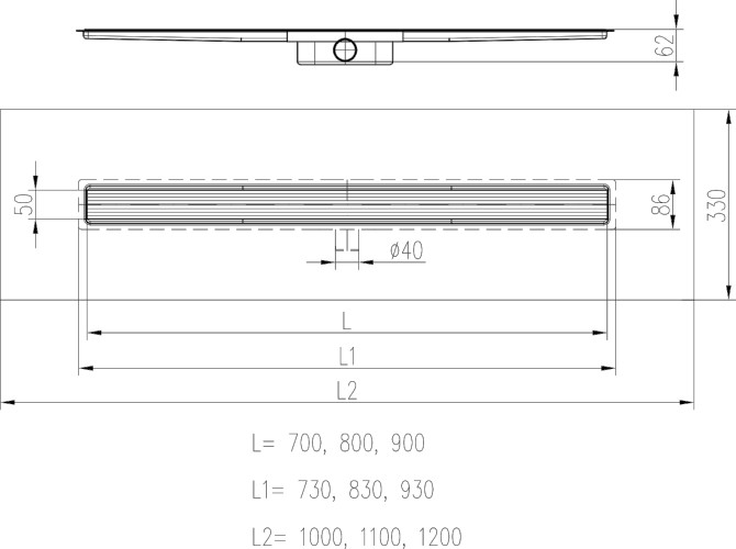 Sumidero lineal de acero inoxidable, 800 mm, sifón lateral D40 y aislamiento