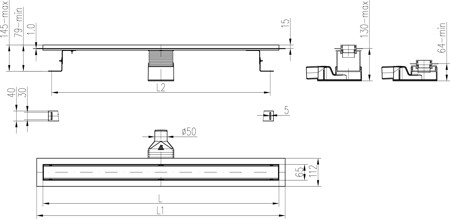 Sumidero lineal de acero inoxidable, sifón lateral D50, 850 mm, rejilla Line brilla