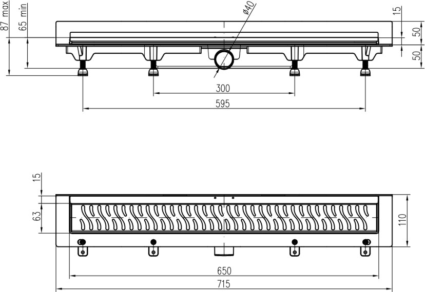 Sumidero lineal de pared con desagüe lateral, D40, 650 mm, rejilla Square brilla