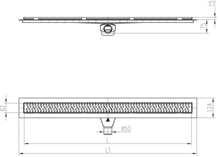 Sumidero lineal negro 650 mm con desagüe lateral D50 y sifón giratorio 360°, rejilla Line negra