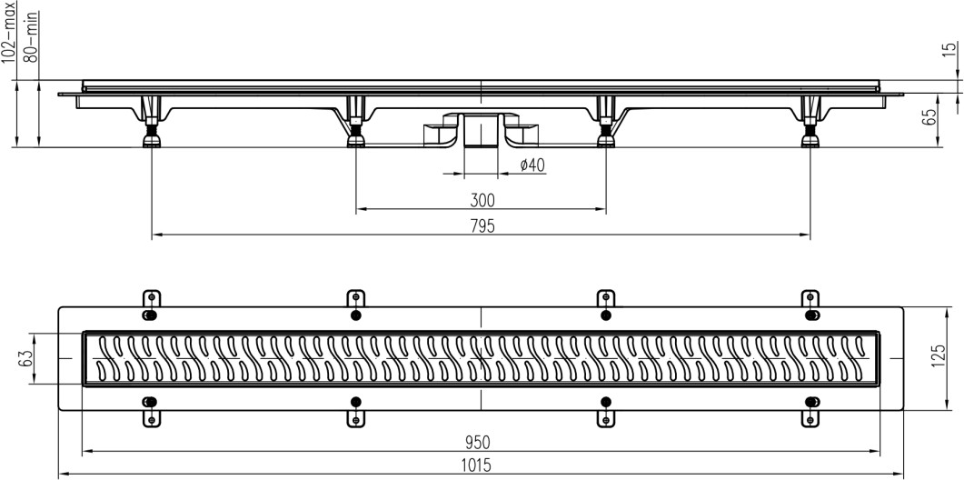 Sumidero lineal negro con desagüe inferior D40, 950 mm, rejilla Harmony negra