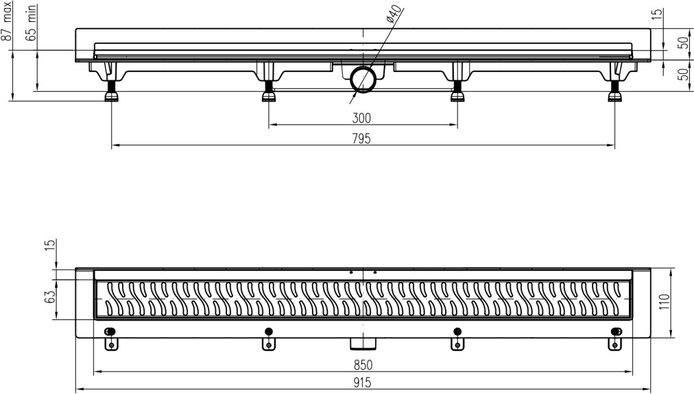 Sumidero lineal negro de pared, desagüe lateral D40, 850 mm, rejilla Square negra