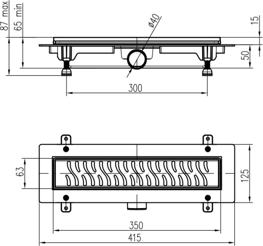 Sumidero lineal negro, desagüe lateral D40, 350 mm, rejilla Harmony negra